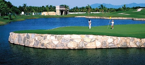 With its massive Mayan Temple stone archway, this course boasts 12 lakes and 3 beach sand bunkers, all of which are part of the unique challenge of this loved golf course.
